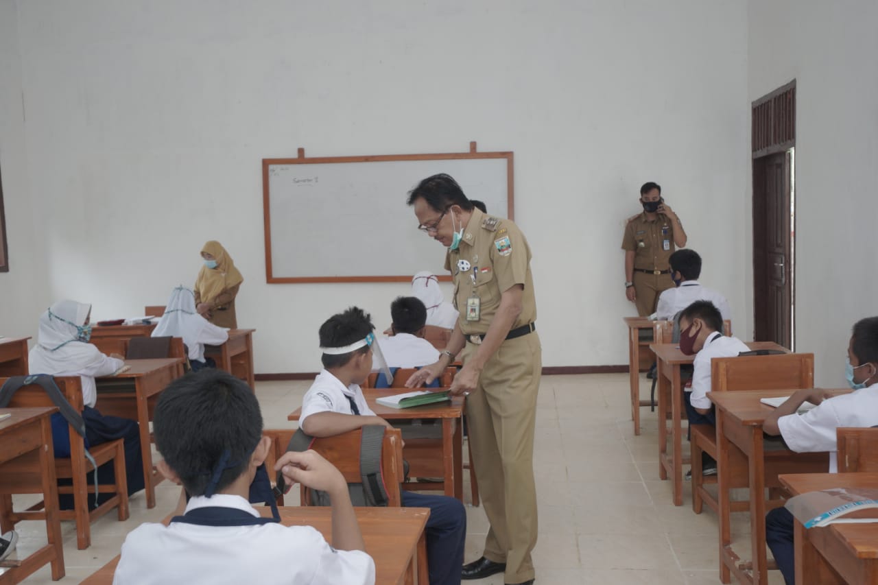 PESISIR BARAT-Bupati Pesisir Barat (Pesibar), Agus Istiqlal meninjau kebersihan dan kedisiplinan guru dalam mengajar, serta penerapan protokol kesehatan (Prokes) sejumlah sekolah di kabupaten setempat, Senin (11/1/2021).