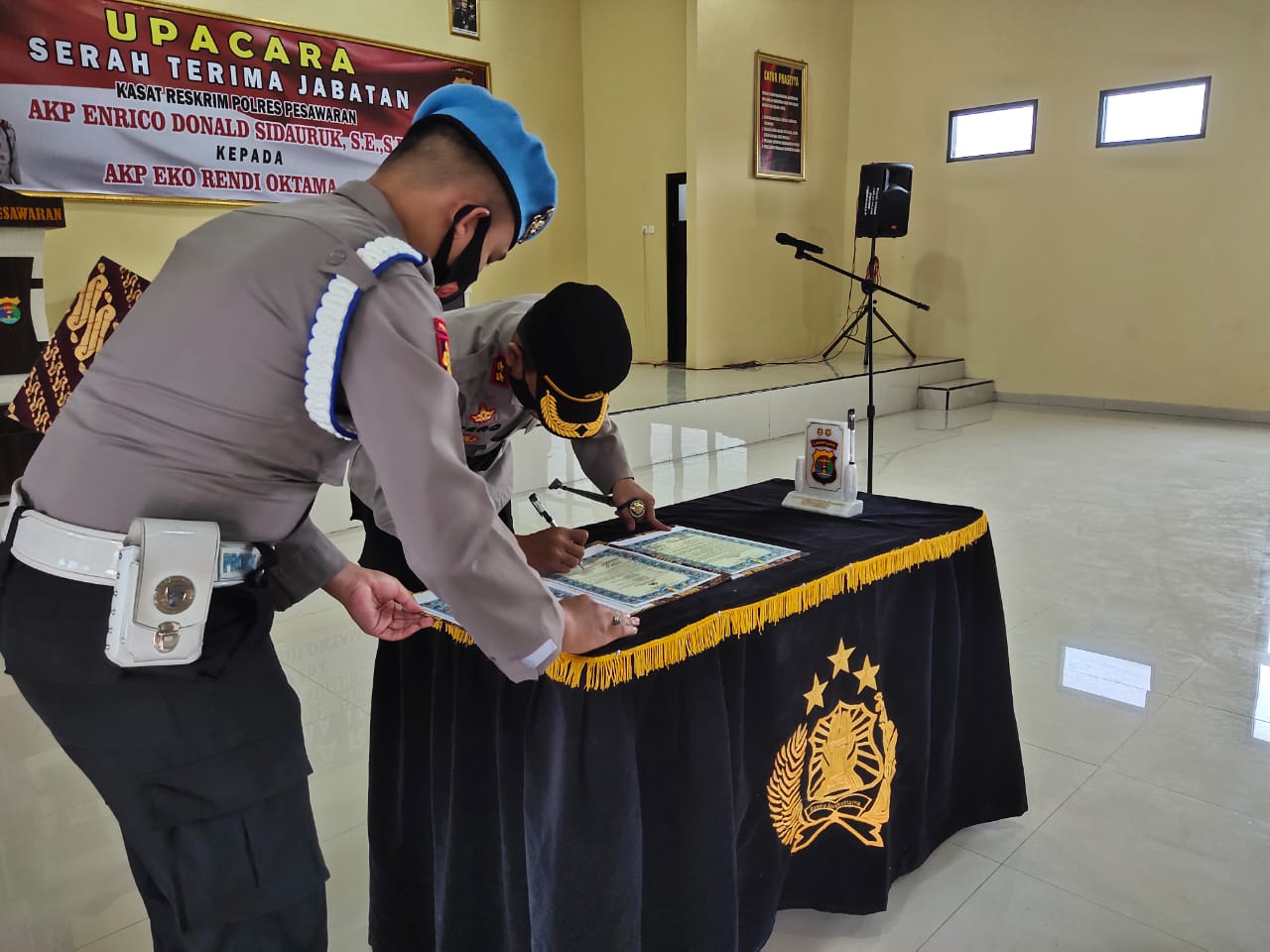 Perwira Polres Pesawaran yang melakukan Sertijab yakni, Kasat Reskrim Polres Pesawaran AKP Enrico Donald Sidauruk kepada AKP Eko Rendi Oktama.