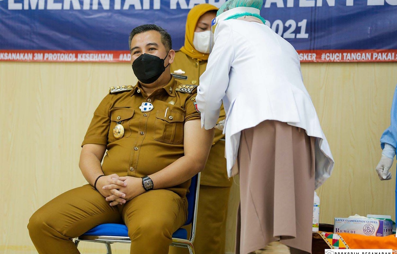 PESAWARAN-Bupati Pesawaran, Dendi Ramadhona menjadi orang pertama di Kabupaten Pesawaran yang disuntik vaksin Covid-19.
