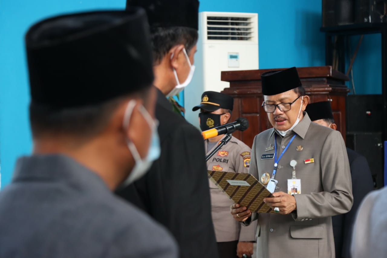 Pembacaan naskah pelantikan oleh Bupati Pesibar Dr. Drs. Hi. Agus Istiqlal, S.H, M.H., menandai pelantikan 9 pejabat eselon II di Lingkungan Pemkab setempat, Rabu (5/1/2022). Foto : Ist