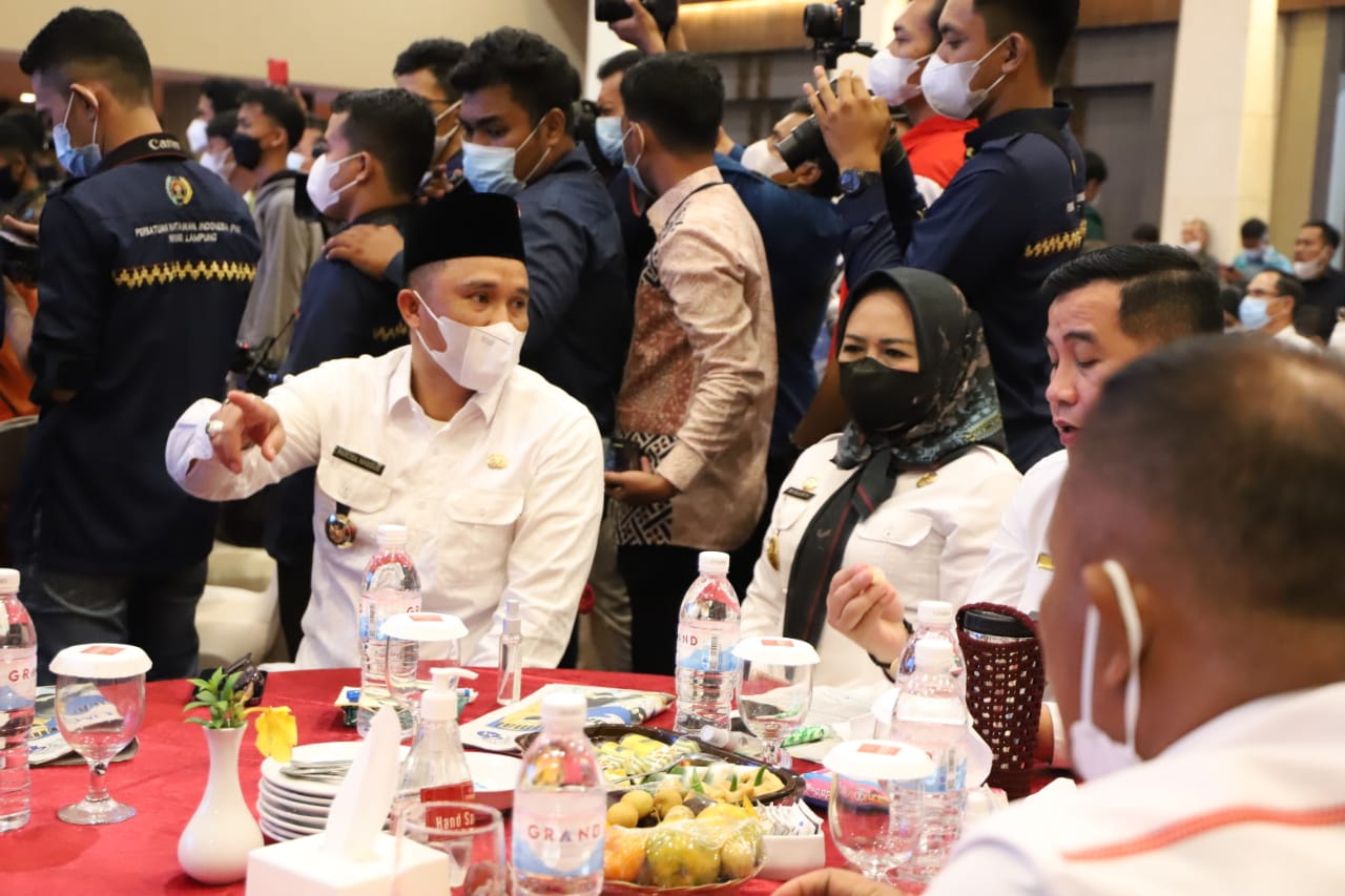 Bupati Lambar H. Parosil Mabsus tengah berbincang dengan kepala daerah lainnya saat menghadiri pelantikan pengurus Persatuan Wartawan Indonesia (PWI) dan Ikatan Keluarga Wartawan Indonesia (IKWI) Provinsi Lampung Masa Bhakti 2021-2026, serta pengurus PWI dan IKWI Kabupaten/Kota se-Lampung, di Ballroom Hotel Emersia- Bandar Lampung, Rabu (5/1/2022). Foto : Ist