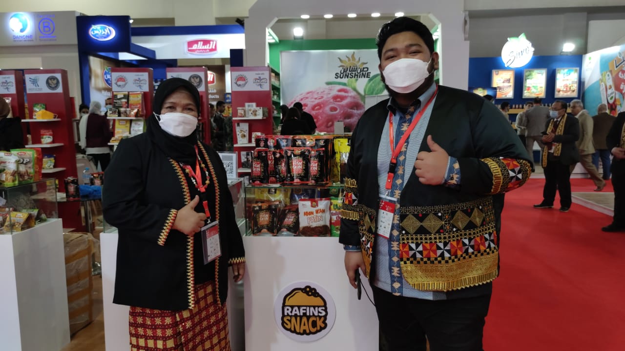 Pemilik Rafin's Snack saat mengikuti event Expo Food Afrika di Mesir selama 3 hari yang diikuti sekitar 20 Negara, pada Desember 2021 lali. Foto : Ist