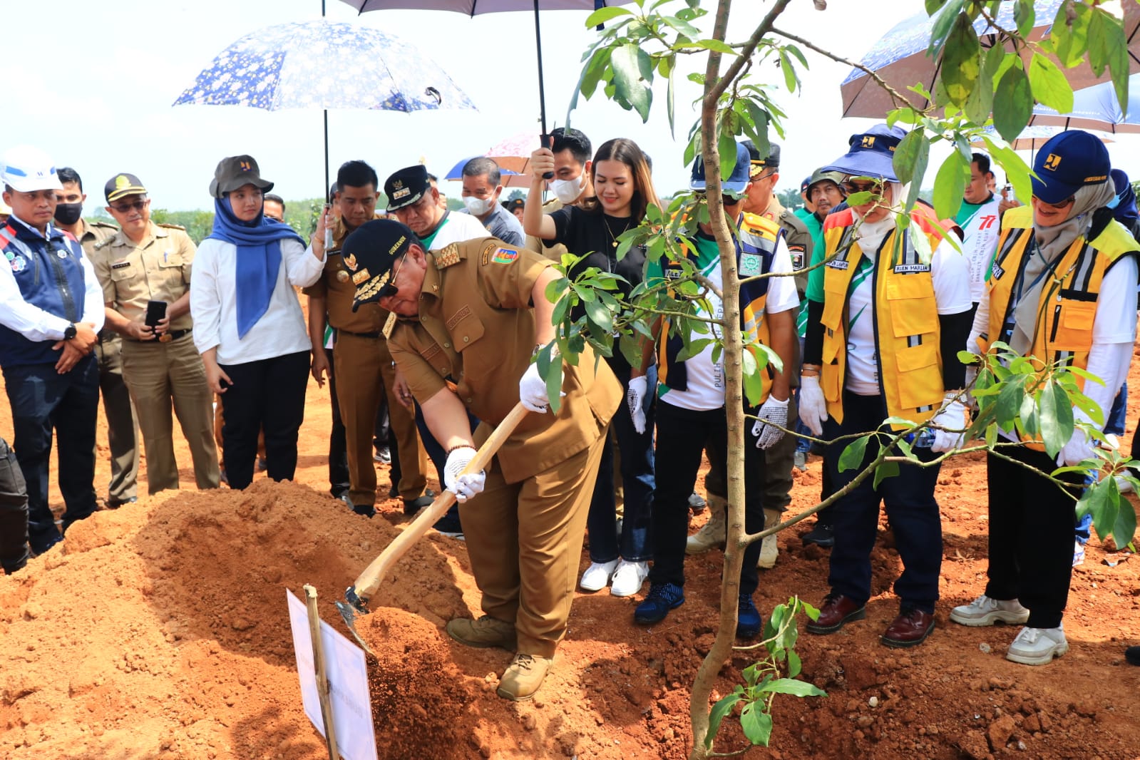 LAMPUNG TIMUR—Gubernur Lampung Arinal Djunaidi melakukan Penanaman Pohon dalam rangka kegiatan Peringatan Hari Bakti PUPR ke-77 di Bendungan Marga Tiga Lampung Timur, Selasa (27/9/2022).