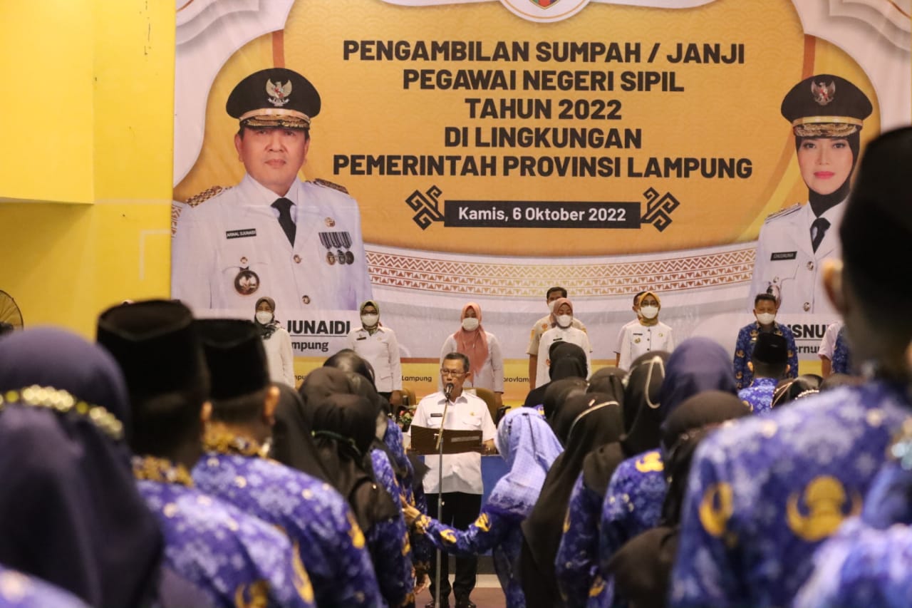 “Melalui pengambilan sumpah janji pegawai negeri Sipil, diharapkan pns dilingkungan Pemerintah Provinsi Lampung memiliki komitmen untuk memegang teguh isi dan makna sumpah janji sebagai landasan membangun kinerja dengan penuh kejujuran, keikhlasan, tanggung jawab serta disiplin yang tinggi dalam menyelenggarakan pemerintahan dan pembangunan di daerah Lampung yang kita cintai.” tutupnya.