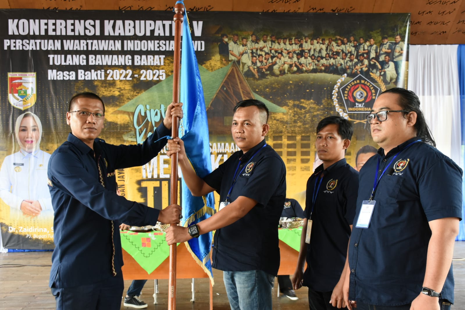 Penyerahan bendera pataka PWI oleh Ketua PWI Lampung Wirahadikusumah kepada Dedi Priyono, menandai pengukuhan Ketua PWI Tubaba terpilih 2022-2025, hasil Konferkab V PWI Tubaba, yang berlangsung di Sesat Agung, Komplek Islamik Center Tubaba, Kamis (20/10/2022) kemarin. Foto : Diskominfo Tubaba