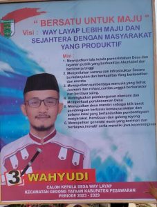 PESAWARAN, Media Histori – Calon Kepala Desa (Cakades) Way Layap Kecamatan Gedong Tataan Wahyudi (Ewok,red), yang akan mengikuti Pilkades serentak pada 17 Desember 2022 mendatang, adalah calon pertama yang memulai memasang baliho sosialisasi calon kepala desa.