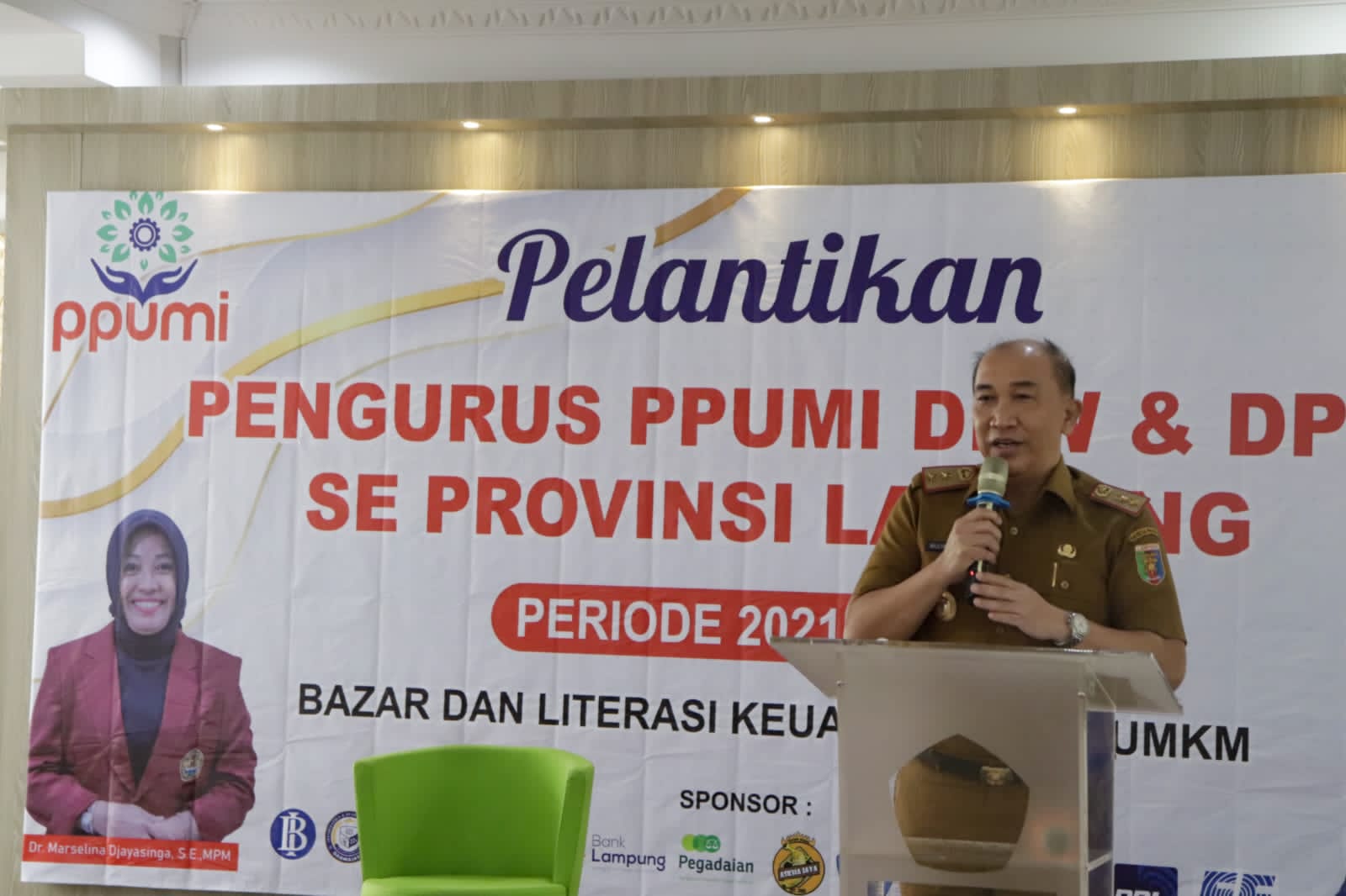 Kepala Bappeda Mulyadi Irsan yang menyampaikan sambutan tertulis Gubernur Lampung menyampaikan ucapan selamat kepada para anggota yang dilantik, dan berharap Pengurus yang baru saja dilantik dapat menjalankan tugas dan tanggung jawab untuk membawa PPUMI menjadi lebih baik serta mampu mewujudkan perempuan UMKM yang berdaya saing tinggi dan menjadi sentra pemberdayaan UMKM di Indonesia khususnya di Provinsi Lampung