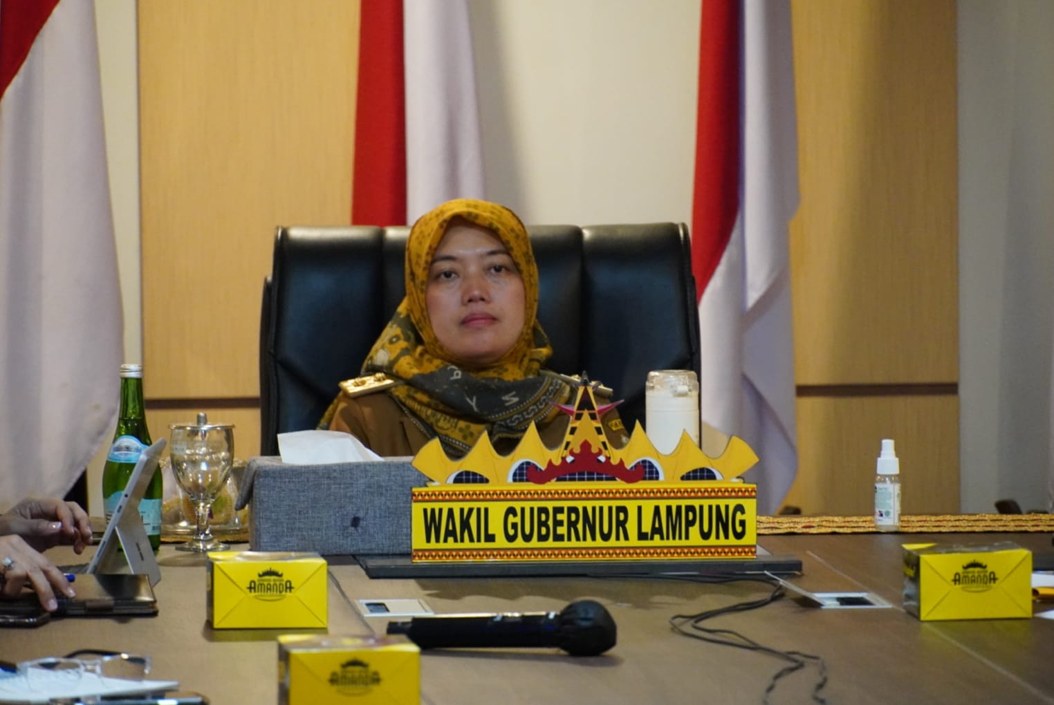 BANDAR LAMPUNG – Wakil Gubernur Chusnunia mengikuti Rapat Koordinasi Pengendalian Inflasi Daerah secara virtual, di Ruang Rapat Sakai Sambayan, Senin (12/06/2023).