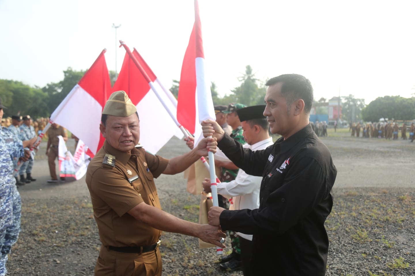 LAMPUNG TIMUR – Bupati Lampung Timur (Lamtim), Dawam Rahardjo menjadi pembina pada Apel mingguan di lingkungan Pemerintah Kabupaten (Pemkab) Lampung Timur dilanjutkan dengan kegiatan pencanangan Gerakan Pembagian 10 juta Bendera Merah Putih Tahun 2023, Senin (07/08/2023).