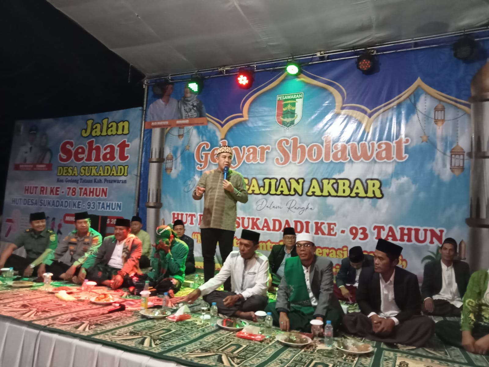 PESAWARAN – Bupati Pesawaran, Dendi Ramadhona bersama masyarakat desa Sukadadi memeriahkan Gebyar Sholawat dan Pengajian Akbar dalam rangka HUT Desa Suka Dadi ke-93 Tahun 2023 di Lapangan Desa Sukadadi Kecamatan Gedong Tataan, Jumat (11/08/2023).