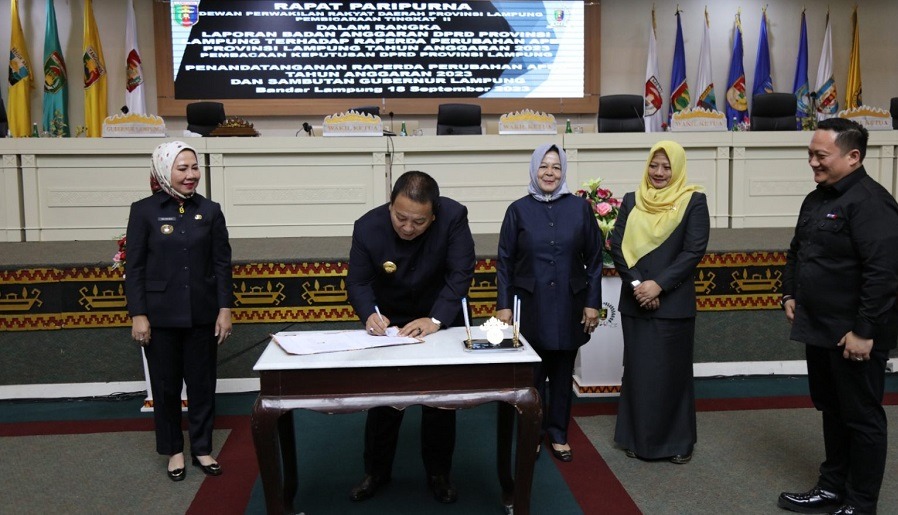 MEDIA HISTORI – Gubernur Lampung Arinal Djunaidi dan Pimpinan DPRD Provinsi Lampung menandatangani Raperda Perubahan APBD Provinsi Lampung Tahun Anggaran 2023 dalam Sidang Paripurna Pembicaraan Tingkat II Persetujuan Bersama Terkait Rancangan Perubahan Anggaran Daerah APBD Provinsi Lampung Tahun Anggaran 2023, di Ruang Sidang Paripurna, Senin, (18/9/2023).