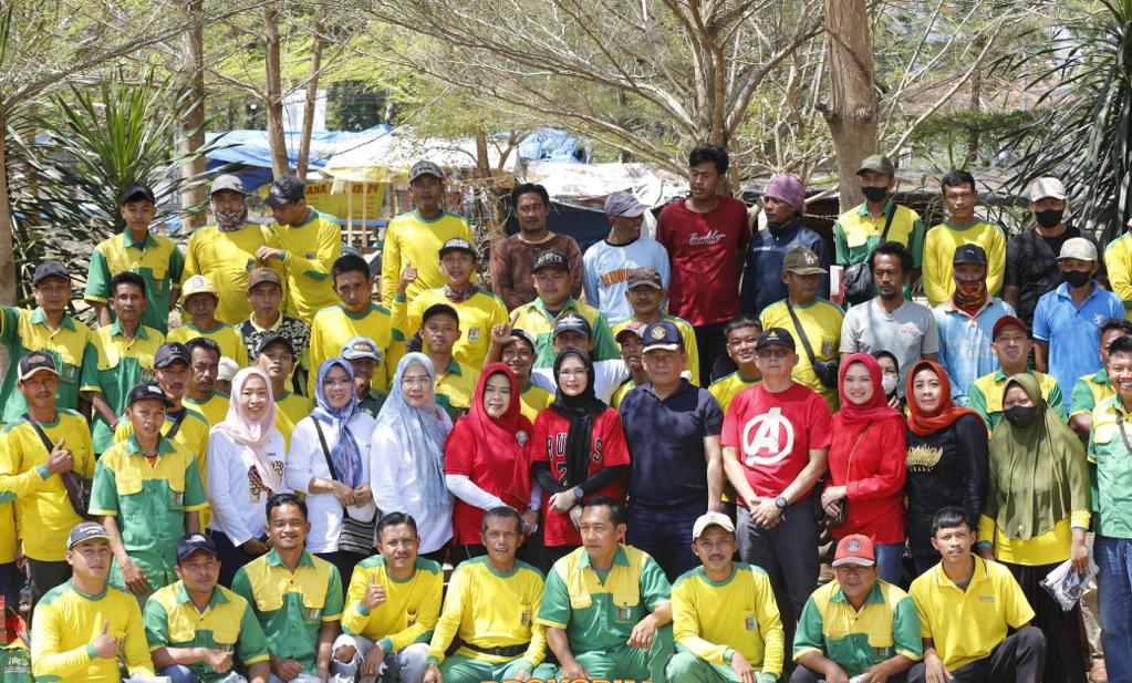 PESAWARAN – Ketua TP-PKK Nanda Indira Dendi dan Asisten Ekonomi dan Pembangunan Setdakab Pesawaran Marzuki menyerahkan baju seragam baru dan santunan untuk para Petugas Satgas Kebersihan di Taman Jejama Sidototo Desa Kebagusan Kecamatan Gedong Tataan Kabupaten Pesawaran. Jum’at (22/09/2023).