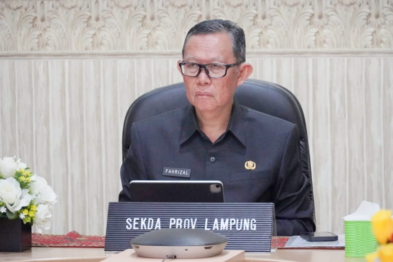 Bandar Lampung — Sekretaris Daerah Provinsi Lampung Fahrizal Darminto, mengikuti Rapat Koordinasi Pengendalian Inflasi Daerah (virtual), di Ruang Command Center Lt.II Dinas Kominfotik Provinsi Lampung, Senin (25/03/2024).