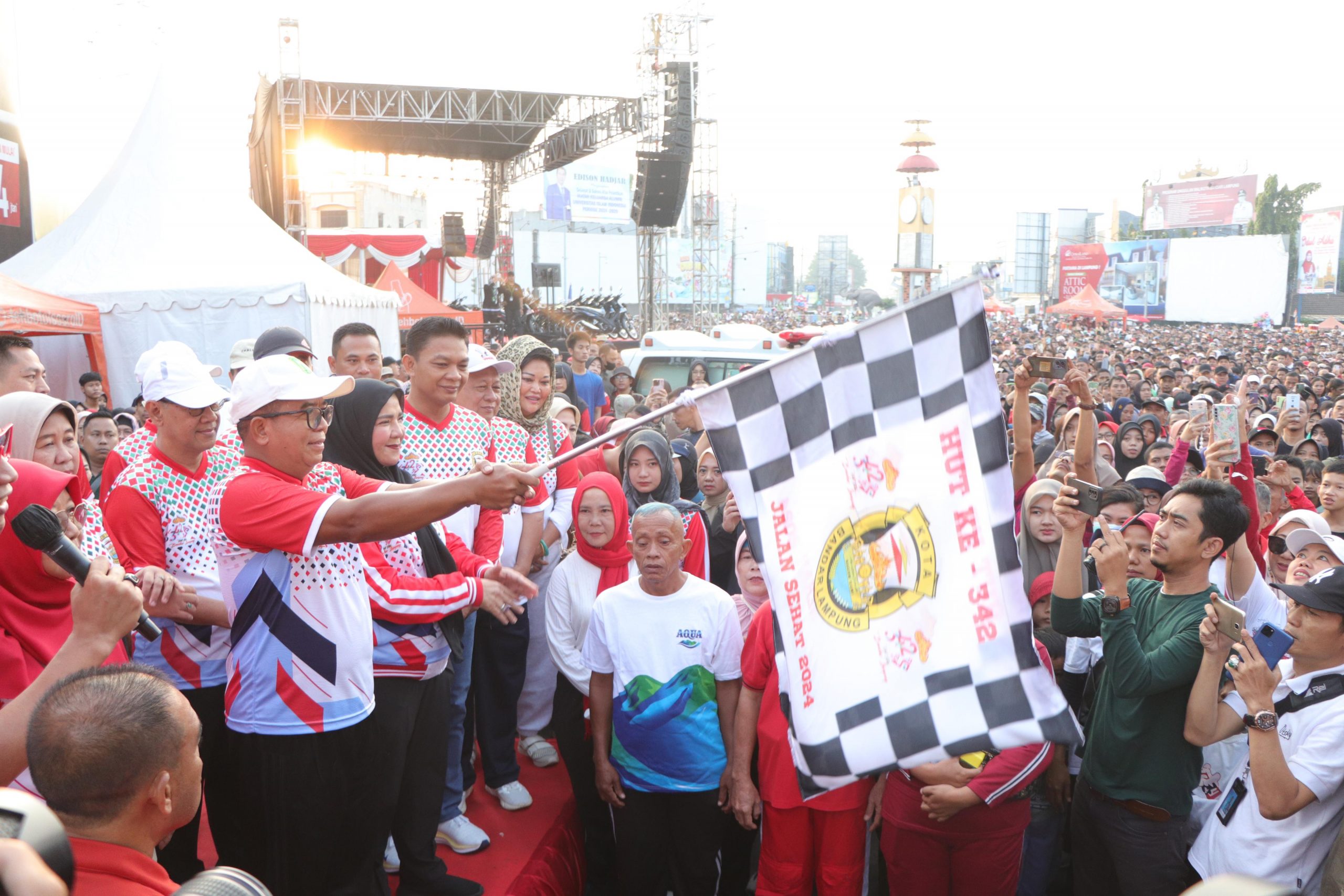 BANDARLAMPUNG—Penjabat Gubernur Lampung Samsudin bersama Walikota Bandar Lampung Eva Dwiana melepas puluhan ribu peserta Jalan Sehat dalam rangka memperingati Hari Ulang Tahun (HUT) Ke-342 Kota Bandar Lampung yang digelar di Tugu Adipura, Minggu (23/06/2024).