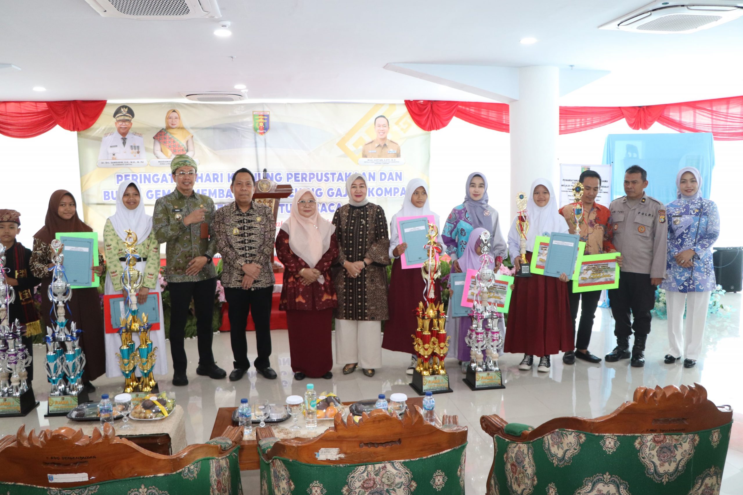 Piala dan Hadiah pemenang lomba diserahkan secara langsung oleh Pj. Bunda Literasi dan Staf Ahli Gubernur Lampung Bidang Kemasyarakatan dan Sumber Daya Manusia didampingi Kepala Dinas Perpustakaan dan Kearsipan Provinsi Lampung. (*/kmf)