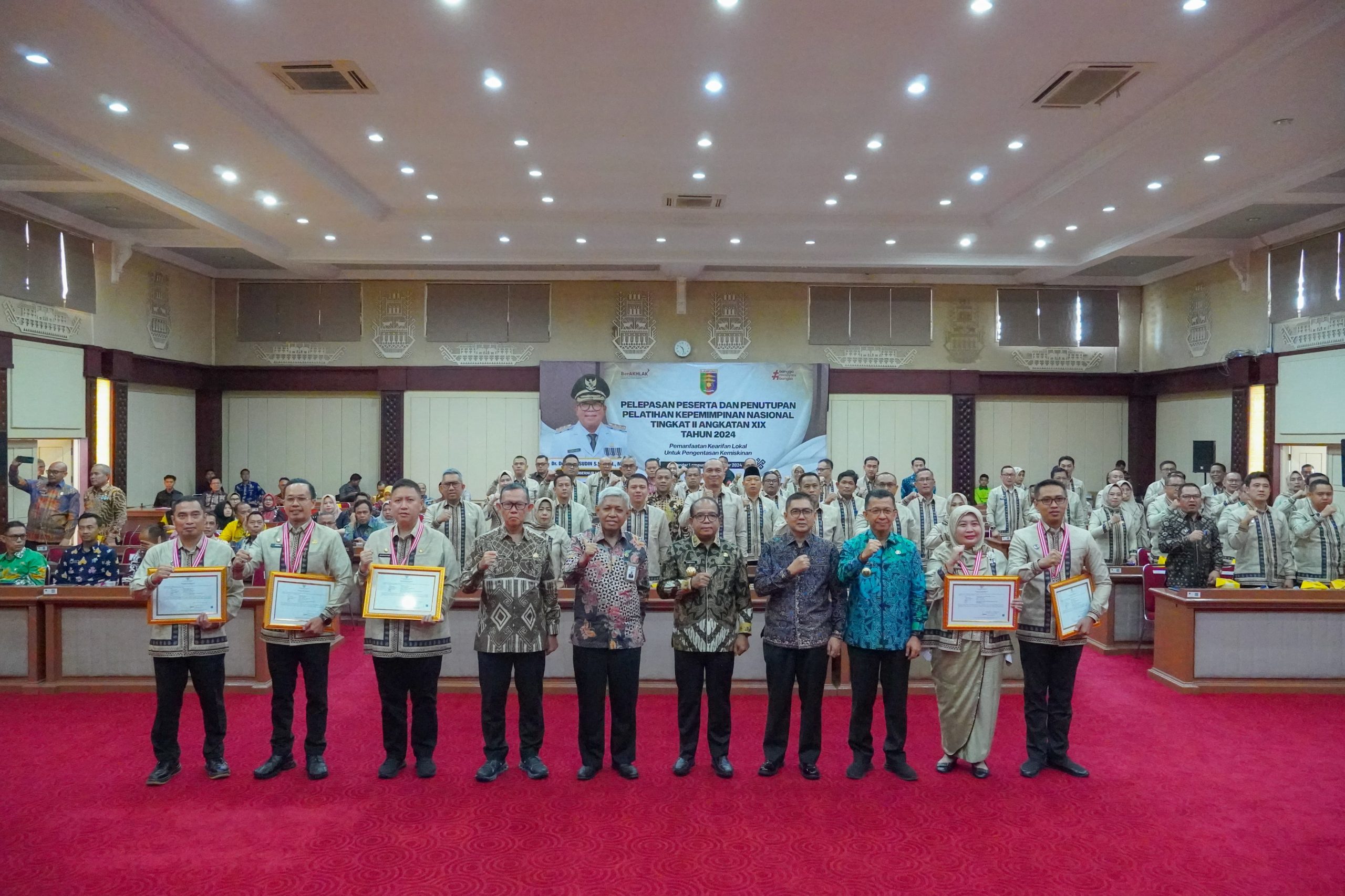 BANDARLAMPUNG—Penjabat Gubernur Lampung Samsudin menutup dan melepas Peserta Pelatihan Kepemimpinan Nasional Tingkat II Angkatan XIX Tahun 2024, bertempat di Gedung Pusiban, Kantor Gubernur Lampung, Jumat (25/10/2024).