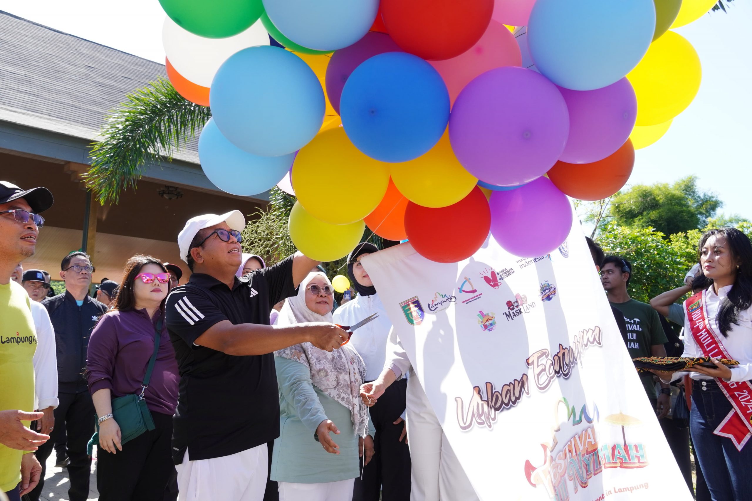 LAMPUNGSELATAN-–Penjabat Gubernur Lampung, Samsudin melakukan pelepasan balon ke udara sebagai tanda secara resmi dibukanya Festival Nemui Nyimah Provinsi Lampung tahun 2024, di PKK Agropark, Sabah Balau, Minggu (27/10/2024).