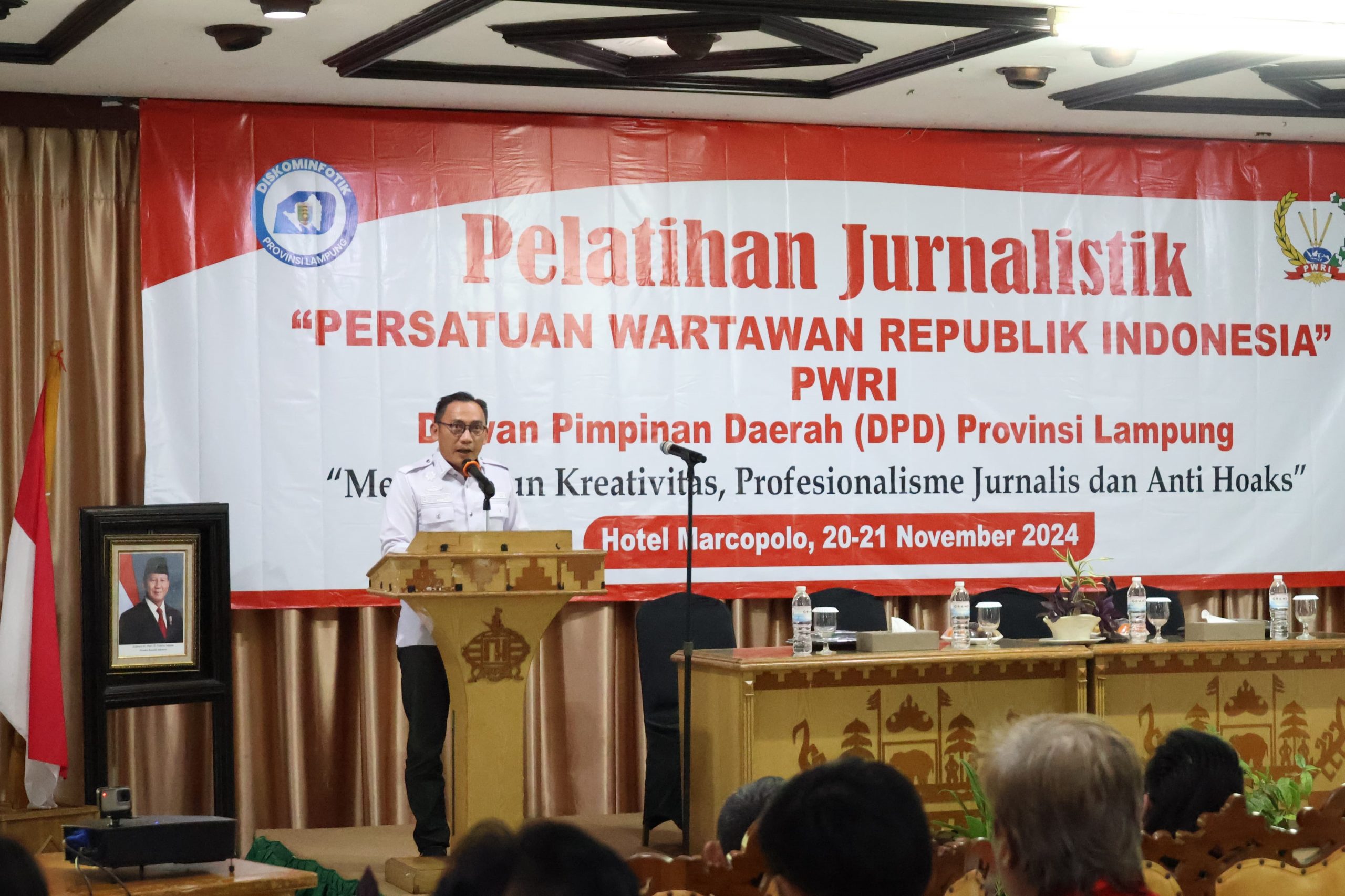 Bandar Lampung, — Kepala Dinas Kominfotik Provinsi Lampung yang diwakili oleh Sekretaris Dinas Kominfotik Provinsi Lampung, Elip Heldan, membuka Pelatihan Jurnalistik yang diselenggarakan oleh Persatuan Wartawan Republik Indonesia (PWRI) Provinsi Lampung, di Hotel Marcopolo, Rabu (20/11/2024).