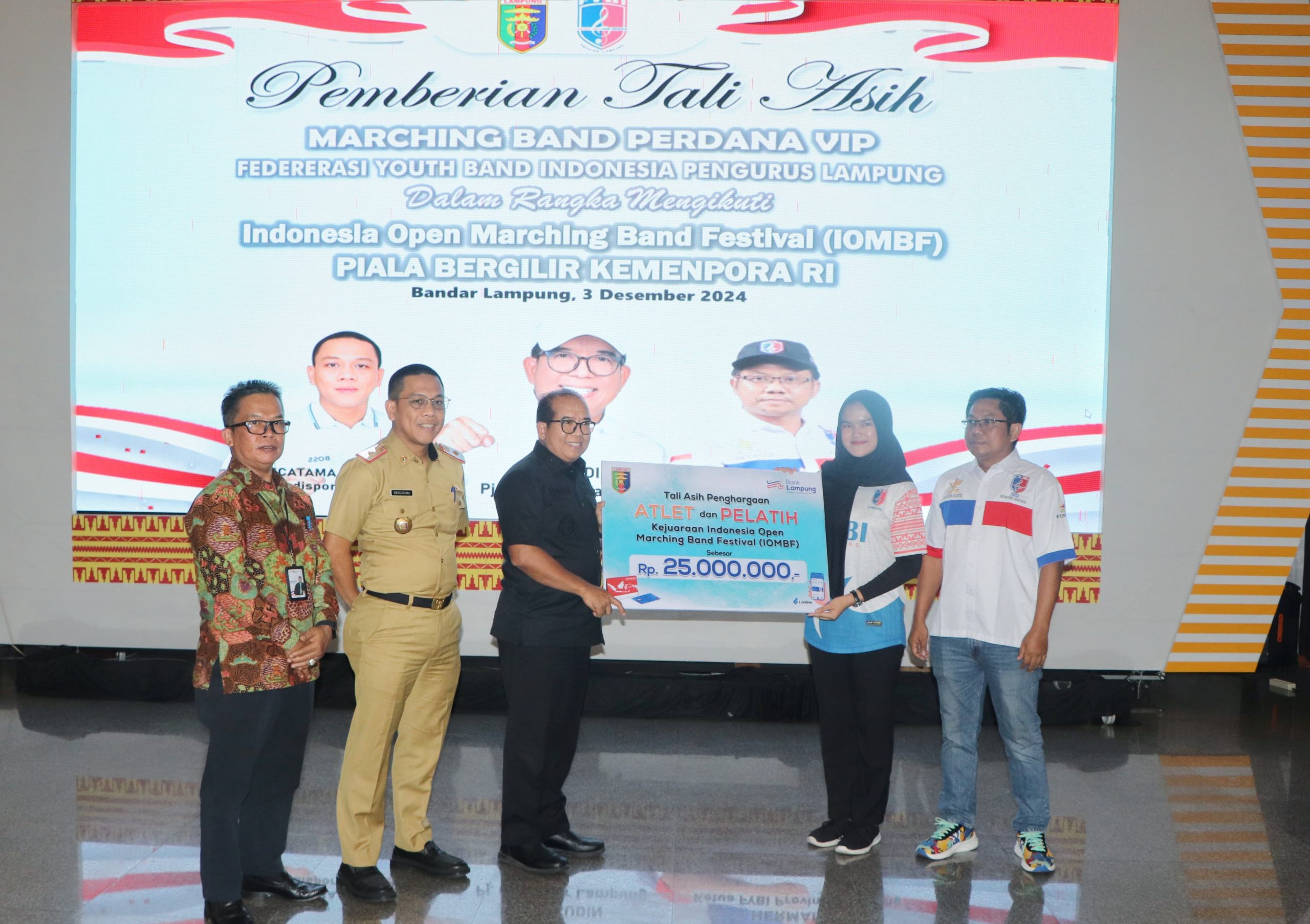 Bandar Lampung —- Pj. Gubernur Lampung, Samsudin menyerahkan penghargaan dan tali asih kepada Marching Band Federasi Youth Band Indonesia (FYBI) Pengurus Lampung, di Mahan Agung, Selasa (3/12/2024).