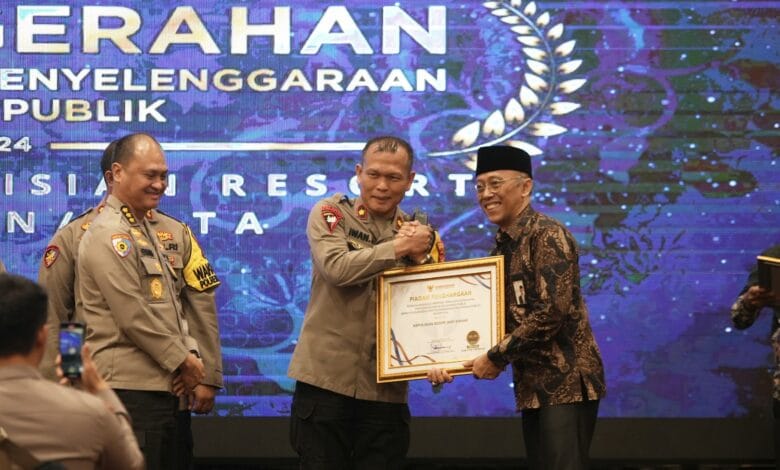 Piagam penghargaan diberikan kepada Kepolisian Resor Way Kanan atas penganugerahan predikat penilaian kepatuhan penyelenggaraan pelayanan publik (Opini Pengawasan Penyelenggaraan Pelayanan Publik) Tahun 2024.