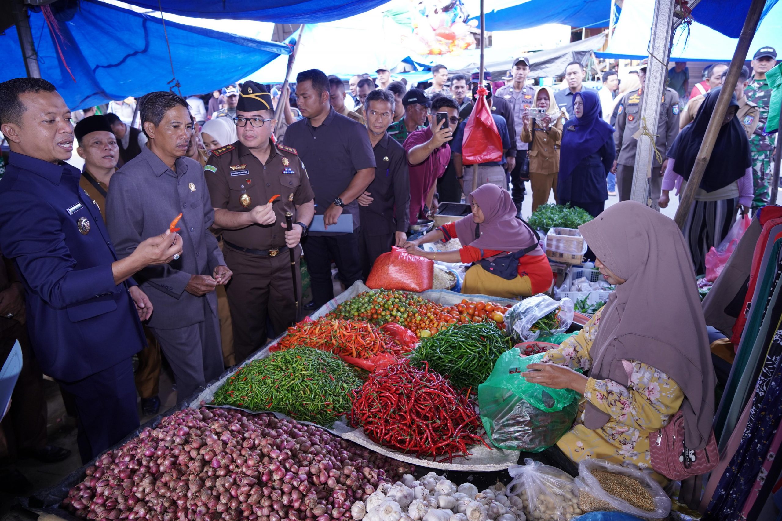 Pringsewu – Bupati Pringsewu, H. Riyanto Pamungkas, bersama Forkopimda Pringsewu turut hadir Kajari Pringsewu Raden Wisnu Bagus Wicaksono, SH., M. Hum, Ketua DPRD Pringsewu Suherman, SE, Dandim 0424 Tanggamus yang diwakili oleh Pabung Pringsewu Kapten Inf Rahmat Hartanto.S.sos, Perwakilan Polres Pringsewu, turut hadir juga Kepala BPS Pringsewu Eko Purnomo, SST., MM, rombongan melakukan inspeksi di pasar tradisional untuk memantau harga dan ketersediaan kebutuhan pokok pada minggu pertama Ramadhan 1446 H, Senin (10/03/2025).