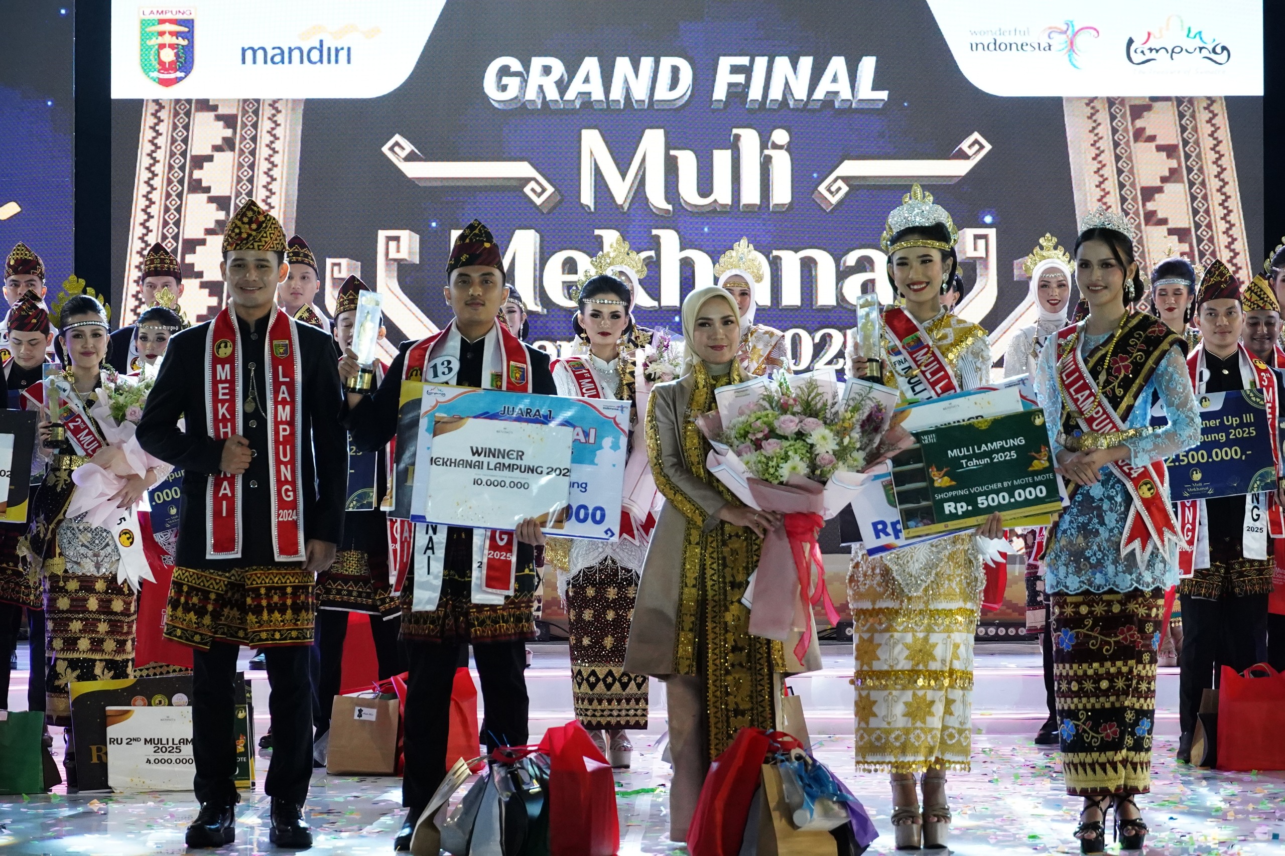Setelah melalui beberapa tahap penilaian, keluar sebagai Pemenang Muli Mekhanai Provinsi Lampung Tahun 2025, diraih oleh Muli asal Kota Bandar Lampung Marcheline Aurely dan Mekhanai asal Kabupaten Tulang Bawang Muhammad Adit Bintang Hartahta.(kmf)