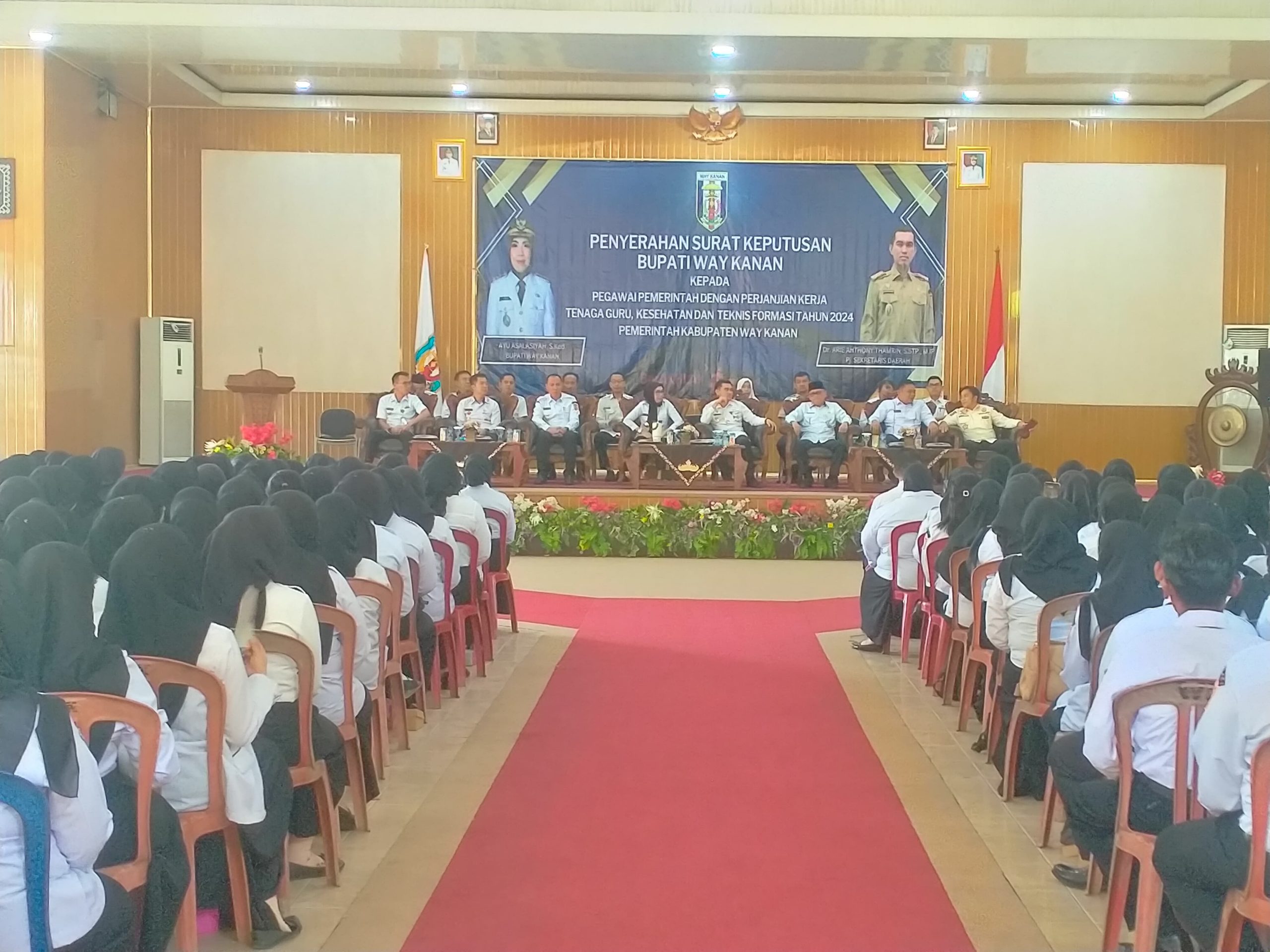 WAY KANAN – Bupati Way Kanan serahkan Surat Keputusan (SK) kepada 400 orang Pegawai Pemerintah Dengan Perjanjian Kerja (PPPK) Tenaga Guru, Kesehatan dan Teknis Formasi Tahun 2024 Kabupaten Way Kanan.