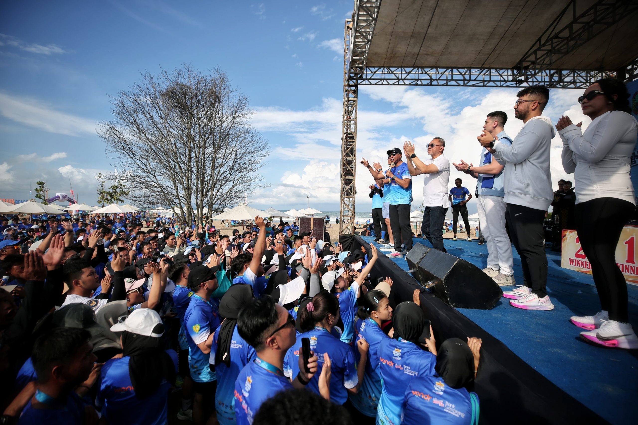 LAMPUNG SELATAN — Menteri Koordinator Bidang Pangan Zulkifli Hasan bersama Gubernur Lampung Rahmat Mirzani Djausal melepas ribuan peserta Krakatau Beach Run 2025 yang digelar di Senaya Beach, Kalianda, Lampung Selatan, Minggu (24/8/2025).