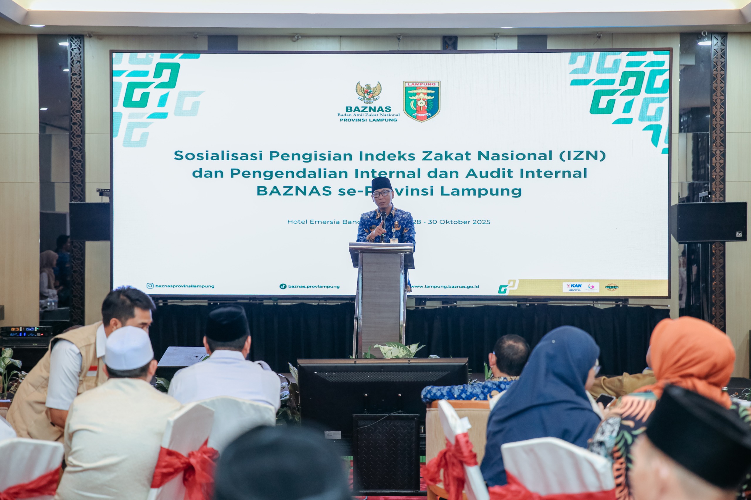 BANDARLAMPUNG — Gubernur Lampung Rahmat Mirzani Djausal membuka Sosialisai Pengisian Indeks Zakat Nasional (IZN) Tahun 2025 dan Audit Internal Badan Amil Zakat Nasional (Baznas) se-Provinsi Lampung, yang berlangsung di Hotel Emersia, Bandarlampung, Selasa (28/10/2025).