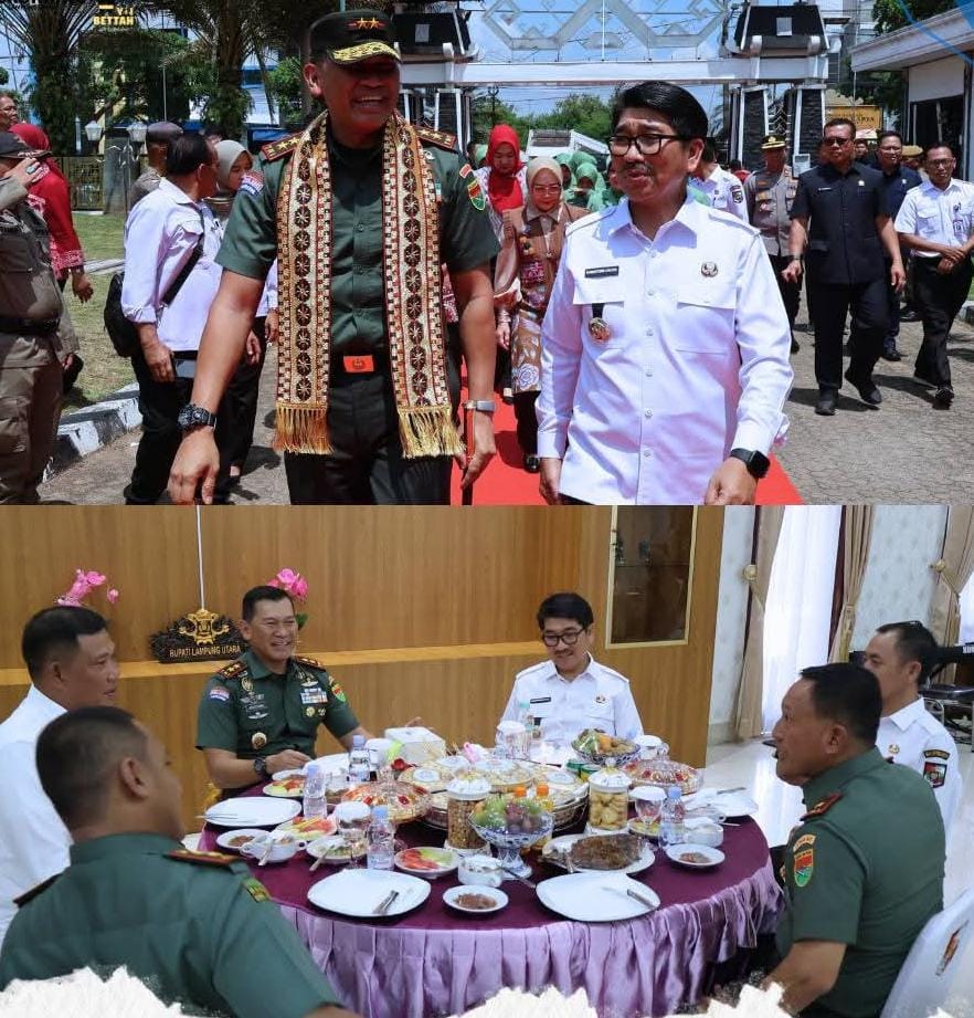 LAMPUNG UTARA — Panglima Kodam XXI/Raden Inten, Mayjen TNI Kristomei Sianturi, S.Sos., M.Si., didampingi Ketua Persit Kartika Chandra Kirana XXI/RI, Ibu Asti Kristomei, beserta jajaran, menghadiri agenda ramah tamah bersama Bupati Lampung Utara, Dr. Ir. H. Hamartoni Ahadis, M.Si., dan Wakil Bupati, Romli, S.Kom., S.H., M.H., bertempat di Rumah Jabatan Bupati.