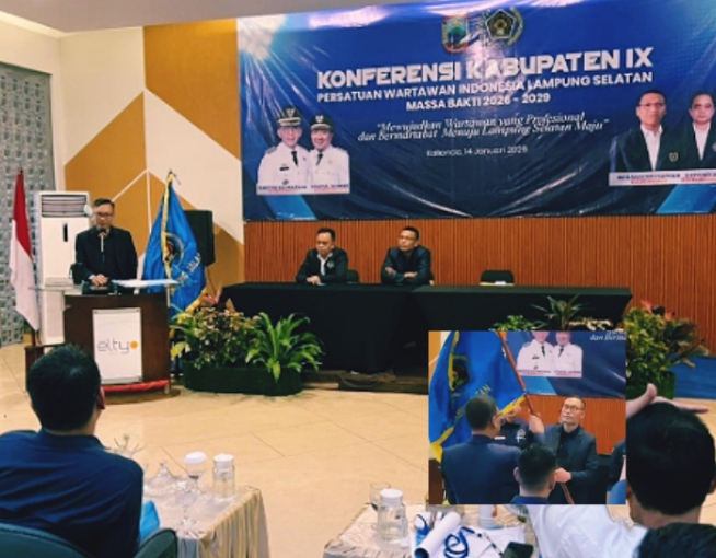 Edwin Apriandi secara resmi terpilih sebagai Ketua Persatuan Wartawan Indonesia (PWI) Kabupaten Lampung Selatan masa bakti 2026–2029. Ia terpilih secara aklamasi dalam Konferensi Kabupaten (Konferkab) IX PWI Lampung Selatan yang digelar di Grand Elty Krakatoa, Kalianda, Rabu (14/1/2026). (Sior)