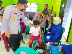 Vaksinasi di Sekolah, Polres Tanggamus Hibur Anak-Anak Dengan “Super Hero”